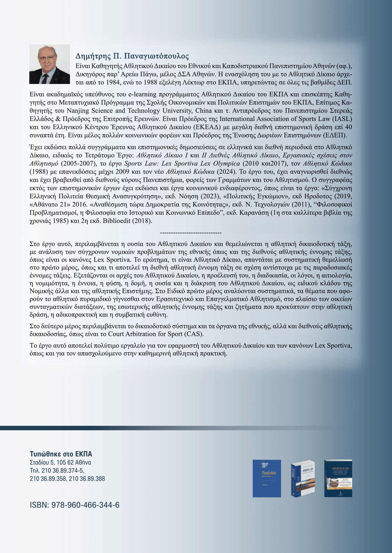 Στο βιβλίο Αθλητικό Δίκαιο. Ουσιαστικό Αθλητικό Δίκαιο- Αθλητική Δικαιοδοσία περιλαμβάνεται η ουσία του Αθλητικού Δίκαιου και θεμελιώνεται η αθλητική δικαιοδοτική τάξη, με ανάλυση των σύγχρονων νομικών προβλημάτων της εθνικής, όπως και της διεθνούς αθλητικής έννομης τάξης, όπως είναι οι κανόνες της Lex Sportiva. Το ερώτημα τι είναι Αθλητικό Δίκαιο απαντάται με συστηματική θεμελίωση στο πρώτο μέρος, όπως και τι αποτελεί τη διεθνή αθλητική έννομη τάξη σε σχέση αντίστοιχα με τις παραδοσιακές έννομες τάξεις. Εξετάζονται οι αρχές του Αθλητικού Δικαίου, η προέλευσή του, η διαδικασία, οι λόγοι, η αιτιολογία, η νομιμότητα, η έννοια, η φύση, η δομή, η ουσία και η διάκριση του Αθλητικού Δικαίου, ως ειδικού κλάδου της Νομικής αλλά και της Νομικής Επιστήμης. Στο Ειδικό πρώτο μέρος αναλύονται συστηματικά τα θέματα που αφορούν το αθλητικό πυραμιδικό γίγνεσθαι στον Ερασιτεχνικό και Επαγγελματικό Αθλητισμό, στο πλαίσιο των οικείων συνταγματικών διατάξεων, της εωτερικής αθλητικής έννομης τάξης και ζητήματα που προκύπτουν στην αθλητική δράση, η αδικοπρακτική και η συμβατική ευθύνη. Στο δεύτερο μέρος περιλαμβάνεται το δικαιοδοτικό σύστημα και τα όργανα της εθνικής, αλλά και διεθνούς αθλητικής δικαιοδοσίας, όπως είναι το Court Arbitration for Sport (CAS). Το έργο αυτό αποτελεί πολύτιμο εργαλείο για τον εφαρμοστή του Αθλητικού Δικαίου και των κανόνων της Lex Sportiva, όπως και για τον απασχολούμενο στην καθημερινή αθλητική πρακτική.