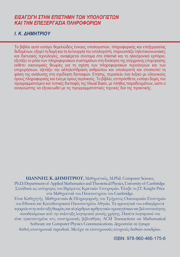 Το βιβλίο αυτό εισάγει θεμελιώδεις έννοιες υπολογιστών, πληροφορικής και επεξεργασίας δεδομένων, εξηγεί τη δομή και τη λειτουργία του υπολογιστή, παρουσιάζει τηλεπικοινωνιακές και δικτυακές τεχνολογίες, αναφέρεται σύντομα στο internet και το ηλεκτρονικό εμπόριο, εξετάζει το ρόλο των πληροφοριακών συστημάτων στη διοίκηση της σύγχρονης επιχείρησης εκθέτει οικονομικές θεωρίες για τη σχέση των πληροφοριακών τεχνολογιών και των επιχειρήσεων, εξετάζει την αλληλεπίδραση ανθρώπου και υπολογιστή και επισκοπεί τη φάση της ανάλυσης στη σχεδίαση διεπαφών. Επίσης, περικλείει ένα λεξικό με ελληνικούς όρους πληροφορικής και ένα με όρους αγγλικούς. Το βιβλίο, επιπρόσθετα, εισάγει δομές του προγραμματισμού και τυπικές διεπαφές της Visual Basic, με πλήθος παραδειγμάτων, ώστε ο αναγνώστης να εξοικειωθεί με τις προγραμματιστικές τεχνικές δια της πρακτικής.