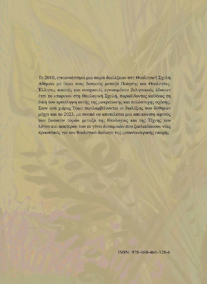 Το 2010, εγκαινιάστηκε μια σειρά διαλέξεων στη Θεολογική Σχολή Αθηνών με θέμα τους δεσμούς μεταξύ Ποίησης και Θεολογίας. Έλληνες ποιητές και στοχαστές εγνωσμένου βεληνεκούς έδωσαν έτσι το «παρών» στη Θεολογική Σχολή, παραδίδοντας καθένας τη δική του πρόσληψη αυτής της μακραίωνης και πολύπτυχης σχέσης. Στον Τόμο αυτόν περιλαμβάνονται οι διαλέξεις που δόθηκαν μέχρι και το 2023, με σκοπό να αποτελέσει μια απεικόνιση αφενός των βασικών τομών μεταξύ της Θεολογίας και της Τέχνης του λόγου και αφετέρου των εν γένει δυναμικών που ξεκλειδώνουν νέες προοπτικές για τον θεολογικό διάλογο της μετανεωτερικής εποχής.